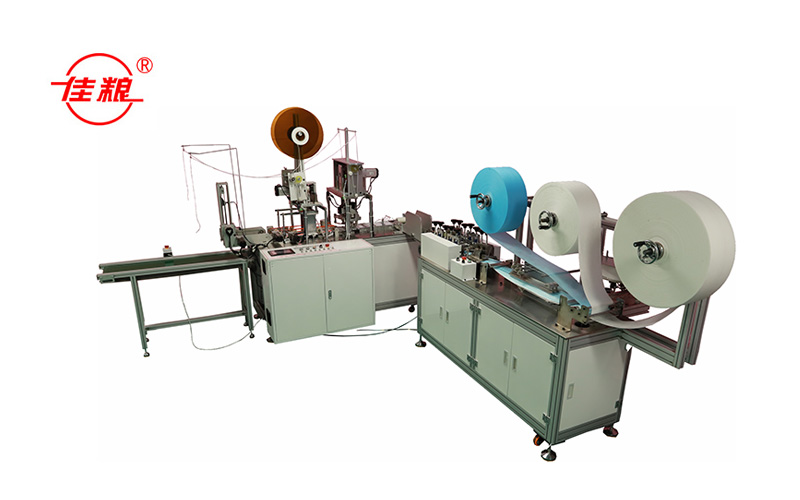 JKPD175/95B fully automatic inner ear edge covering mask machine is composed of raw material frame part, mask folding part, nose bridge bar feeding part, mask sheet hot melt shaping part, mask sheet conveying across the bridge part, ear band welding part, covering edge welding part and mask finished product assembly line part. This production line, after workers install raw material coil and nose bridge coil, automatically completes folding, nose bridge feeding, heat synthesis forming, spot welding ear band, cutting off after covering edge to get standard finished mask finally, and then presses it down to mask finished product line. The produced mask is standard and suitable to wear, which can be used for medical and civil use.