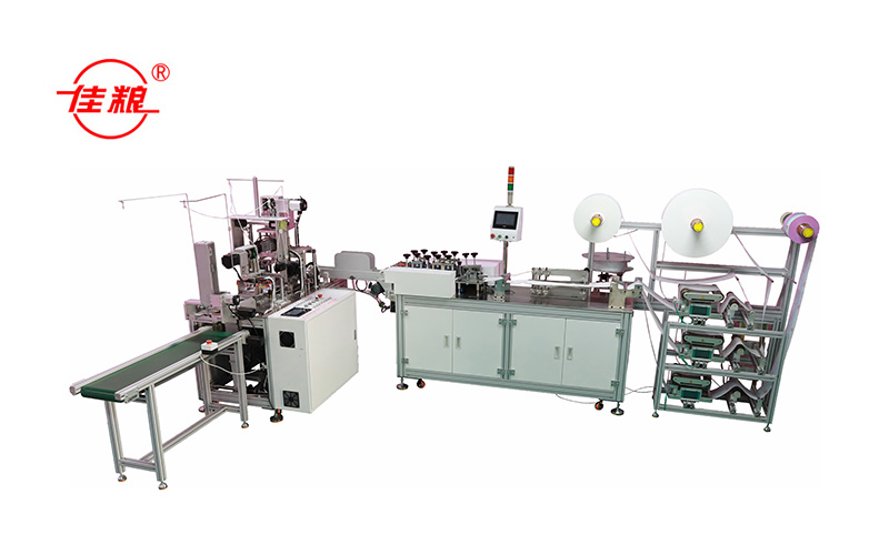 JKPQ175/95D fully automatic (positioning) mask machine is composed of automatic tension rectifying part, mask folding part, nose bridge bar feeding part, mask sheet hot melt shaping part, mask sheet conveying across the bridge part, ear band welding part and mask finished product assembly line part. This production line, after workers install raw material coil and nose bridge coil, tension rectifying system adjusts position, automatically completes folding, nose bridge feeding, heat synthesis forming, spot welding ear band to get standard finished mask, and then presses it down to mask finished product line. The produced mask is standard and suitable to wear, which can be used for medical and civil use.